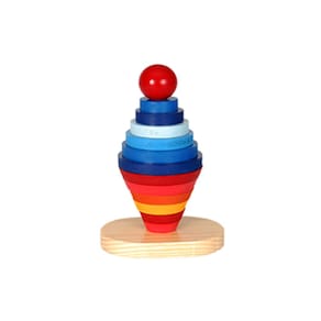 Contém 1 base medindo C 14cm x P 9,0cmx A 25cm e 12 peças em madeira coloridas em formato cilíndrico e cônico, com medidas diversas. Peças pintadas com tinta atóxica.
