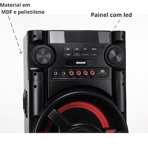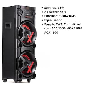 Especificações técnicas: - Sistema de Iluminação: LED DECORATIVO - Potência: 1000W - 2 Alto-Falantes de 8" polegadas - 2 Tweeter de 1" - Frequência: 50-60Hz - Equalizador: Sim - Função Bluetooth: Sim - Função TWS: Sim (Com ACA 1000 / ACA 1300 / ACA 1900) - Função Power X: Sim - Função Microfone Prioridade: Sim - Entradas: 1 Entrada para Microfone e 1 Entrada para Instrumento - Função: Passa e Volta pasta - Função Gravar: Não - Não possui Bateria - Não Possui Rádio FM - Não possui Controle Remoto - Possui Rodinhas - Alça de Transporte: Sim - Material: MDF / Polietileno - Cor: Preto - Consumo Máximo de Energia: 60W - Bivolt: Sim - Suporte para Pedestal/Tripé: Não