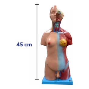 torso de 45cm, bis5exu4l / assexuado, com coluna exposta, em 25 partesdescrição:modelo de torso humano, medindo 45cm. apresenta com riqueza de detalhes, estruturas anatômicas da cabeça, pescoço e tronco com parede torácica desmontável, sendo esta feminina, exibindo glândulas mamárias e seio. órgãos internos desmontáveis, como pulmão, coração, intestinos, rins, etc.órgãos g3n17415 masculino e feminino intercambiáveis, com conversão para forma assexuada. estrutura do lado esquerdo do torso apresenta musculatura superficial, e lado direito com pele.é possível observar na parte posterior do modelo, uma abertura da região do cer363lo até a região do c0cc1x, ramificações nervosas, vértebras, sendo uma removível e desmontável em duas partes. modelo confeccionado resina plástica e borracha, montado sobre base.composto por:cabeça (crânio, hemisfério cerebral esquerdo e globo ocular) - 3 partesparede torácica feminina 1 partepulmões - 2 partescoração - 2 partesfígado com vesícula biliar - 1 parterins, sendo do lado direito a metade anterior removível – 2 partesestômago - 2 partesintestino - 4 partescoluna vertebral com vértebra removível em - 2 partesórgão g3n174l masculino - 2 partesórgão g3n174l feminino - 3 partes com embrião removívelórgão assexuado - 1 parteo modelo tgd-0206-f permite:o estudo da anatomia do corpo humano através do modelo de torso altamente didático;retirar o hemisfério cerebral esquerdo e globo ocular da estrutura do crânio, visualizando parte interna da face como palato e cavidade nasofaringe;visualizar estruturas da faringe, cartilagens e músculos;visualizar veia jugular e artéria carótida;visualizar tórax feminino com musculatura e glândula mamária do lado esquerdo e seio do lado direito; composto também por costelas e porção final do esterno na parte anterior; parte interna do tórax é possível visualizar músculos, costelas e esterno;desmontar os pulmões visualizando estrutura interna como os brônqu105 e suas ramificações, divisão dos lobos pulmonares e vasos sanguíneos;desmontar o coração em duas partes visualizando estrutura interna como a divisão das câmaras cardíacas, valvas, principais veias e artérias e musculatura externa do coração;desmontar e visualizar órgãos da cavidade abdominal como: estômago, desmontável em duas partes exibindo estruturas internas como as pregas gástricas e intestino, desmontável em quatro partes (ceco, colón ascendente, cólon transverso, cólon descendente, jejuno, íleo);visualizar fígado com vesícula biliar e o baço;visualizar rins, sendo o rim direito desmontável a parte anterior possibilitando visualizar parte interna; realizar mudança dos órgãos g3n17415, sendo: órgão que o g3n174l masculino é desmontável em duas partes, possibilitando a visualização e estudo da estrutura interna com vasos sanguíneos, etc. e órgão g3n174l feminino desmontável em três partes, mostrando estruturas internas e embrião que pode ser removido do útero; ser colocado também órgão assexuado;visualizar através do c0r73 frontal, estrutura da coluna vertebral como vértebras cervicais, torácicas e lombares; ramificações nervosas, parte interna da região da nuca, 6vl60 cerebral; r3m0v3r uma vértebra para melhor entendimento da estrutura da coluna vertebral.