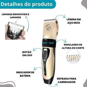 Tosa recarregável dourada - para cães e gatos em casa Descrição do anúncio: Conteúdo da embalagem: 1 x máquina de tosa com bateria embutida 4 x pentes de nível 3mm, 6mm, 9mm, 12mm 1 x cabo de carregamento usb 1 x escova de limpeza 1 x manual do usuário 1 x lubrificante Características: Design sem fio: equipamento com bateria recarregável de 1200 mah, para uso sem conexão com cabos. Baixo ruído: operação silenciosa abaixo de 50 db para conforto dos pets. Segurança e precisão: lâmina de liga de titânio para cuidados com a pele dos animais. Pente ajustável: 4 pentes de proteção para cortes de cabelos seguros e precisos. Fácil limpeza: lâmina removível para e limpeza facilitadas Especificações: Carregador: bivolt Saída do adaptador: ac 3.7v 1200ma Entrada do adaptador: 110v-240 v 50/60hz Tempo de funcionamento: até 120 minutos com carga completa Tempo de carregamento: aproximadamente 5 horas Tensão de trabalho: 3.7v Tamanho da máquina: 185x45mm comprimento x largura Principais perguntas sobre o produto e resposta: Quanto tempo dura a bateria após um carregamento completo a bateria de 1200mah permite até de 120 minutos de uso contínuo, após um carregamento de 3-5 horas. É fácil limpar a máquina após o uso sim, a lâmina é removível para facilitar a limpeza e a manutenção da máquina. As lâminas são seguras para a pele sensível de estimação sim, a lâmina de liga de titânio proporciona um corte preciso sem puxar os pelos ou irritar a pele dos pets. Marca: Não Informado Ean: 7906036498732