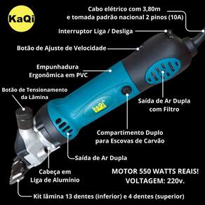 Tosquiadeira Máquina Tosa 550W Kit Lâminas Ovelha Carneiro Ovino 220v KaQi 6576 Tosquiadeira Elétrica Máquina de Tosa Potência Real de 550 Watts Ajuste de velocidade 2400 RPM. Jogo de Lâminas Incluso. VOLTAGEM: 220v. Acompanha maleta para transporte, par de carvões extra e kit manutenção. Surpreenda-se com a super Tosquiadeira Máquina de Tosar KaQi SG-6576. Voltagem 220v. Indicada para aparar e cortar pelos de ovelhas, carneiros, ovinos, caprinos, lhamas, alpacas não indicado para cachorros ou cavalos . Equipado com um poderoso motor de 550 Watts de potência real, de alto toruqe, sistema easy-start partida suave , chave seletora on/off, ajustes de níveis de velocidade até 2400 RPM , regulagem de espessura de corte, além de empunhadura ergonômica. Ideal para tornar a operação de tosa mais rápida, prática e fácil no dia a dia. Acompanha duas lâminas universais de corte, sendo uma superior com 4 dentes, e outra inferior com 13 dentes. Suas lâminas de alta qualidade, dureza e resistência, com pontas afiadas e usinadas, evitam ferimentos nos animais durante a tosa. Seu sistema de encaixe de lâminas é universal e pode ser utilizada com a maioria das lâminas de outras marcas do mercado. Conta ainda com botão de regulagem de tensão, o qual permite alterar a espessura do corte. O corpo da tosquiadeira é feito de PVC durável, leve, ergonômico e confortável, com apenas 1,8kg, o que garante que a empunhadura se adapte facilmente ao formato da mão para uma operação ágil e segura no corte da lã. Para maior comodidade e praticidade, conta com ajuste de velocidades, de 0 a 2400 RPM. Em geral, as velocidades até o nível 3 ou 4 são usadas para o pescoço e pernas dos animais. Já as velocidades na escala de 4 a 6 são adequadas para as costas, abdômen e quadris. Uma inovação nos modelos 6576 KaQi são as aberturas de ventilação que visam maior resfriamento durante a operação prolongada. Ao todo, são 4 pontos de saída de ar, sendo que 2 deles, com filtro embutido para evitar entrada de lã no motor. Segue com uma maleta para transporte e para organização do equipamento, além de kit ferramenta chave de fenda, bisnaga para lubrificantes e óleos, par de carvões extra, pincel para limpeza e manual de instruções. Uma tesoura elétrica única, com design, acabamento e materiais superiores Para funcionamento é necessário conectar à rede elétrica. Atinge aproximadamente 85 decibéis dB de ruído, o que não causa transtorno aos animais. Recomendada para aparar de 5 a 10 ovelhas por hora, o que é adequado para fazendas ou ranchos familiares. Uso de óleos, sprays de resfriamento, também podem ser utilizados durante a tosa, podendo aumentar a capacidade de corte. Conteúdo da embalagem: 1 Tosquiadeira Elétrica Pro 220v KaQi 6576. 1 maleta de transporte. 2 escovas de carvão já instaladas. 2 escovas de carvão sobressalentes. 1 frasco para óleo. 1 escova de limpeza. 1 chave de fenda. 1 manual de instruções. Especificações: Voltagem: 220v. Motor Potência Real: 550 Watts. Velocidade Ajustável: 0 a 2400 RPM. Cabeça da Tosquiadeira: Liga de Alumínio. Corpo da Tosquiadeira: PVC. Plugue: tomada padrão brasileiro 2 pinos 10A . Cabo elétrico: 3,80m. Frequência: 60Hz. Medida da Tosquiadeira: 34 x 9 x 7cm. Peso da Tosquiadeira: 1,8kg. Tamanho da maleta: 44 x 19 x 10cm. Peso total: 2,8kg. : 3 Meses. EAN: 7898692941044 Marca: KaQi. Sempre utilizar equipamentos de EPI para maior segurança.