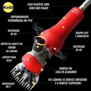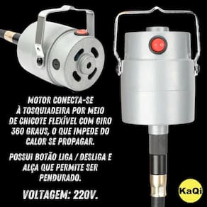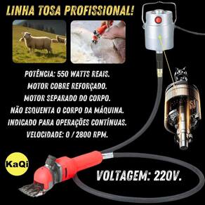 Tosquiadeira Suspensa Máquina Tosa 550W Motor Kit Lâminas Ovelha Carneiro Ovino Cabra 220v KaQi 6676 Tosquiadeira Suspensa Elétrica KaQi 6676 Potência 550 Watts Reais. 2800 RPM. VOLTAGEM: 220v. Surpreenda-se com a Tosquiadeira Máquina de Tosar KaQi 6676-220v. Voltagem 220v. Indicada para aparar e cortar pelos de ovelhas, carneiros, ovinos, caprinos, lhamas, alpacas não indicado para cachorros ou cavalos . aceita tosquias tipo australiana, Tally-Hi, tosquia gaúcha, entre outras técnicas. O animal não precisa ser amarrado, o que reduz o risco de ferimentos e proporciona mais bem estar. Assim, torna a operação mais produtiva e permite a separação do velo inteiro, com melhor classificação e separação das categorias da lã. Seu maior diferencial, um poderoso motor de 550 Watts de potência real, velocidade única 0 - 2800RPM, de alto torque, com chave seletora on/off, o qual pode ser instalado de modo suspenso e conectado à tosquiadeira por meio de chicote flexível de 1,70m com giro de 360 graus. Desta forma, pelo fato do motor não estar acoplado dentro da tosquiadeira, como acontece nas máquinas regulares de tosa elétrica, acaba por não transmitir calor. A tosquiadeira tem regulagem de espessura de corte, empunhadura ergonômica, aletas laterais para dissipação de ar, botão de tensionamento das lâminas permite alterar a espessura do corte , e acesso fácil para colocação de óleo lubrificante. Como o chicote flexível tem sistema de giro de 360 graus, o operador não precisa se preocupar com o fio enrolar conforme muda de posição, já que gira conforme sentido que a máquina é direcionada. Ideal assim, para tornar a operação de tosa mais rápida, prática e fácil no dia a dia. Acompanha duas lâminas de corte, sendo uma superior com 4 dentes, e outra inferior com 13 dentes. São de alta qualidade, dureza e resistência, com pontas afiadas e usinadas, o que evita ferir os animais. Seu sistema de encaixe de lâminas é universal e pode ser utilizado com a maioria das demais lâminas do mercado. Ainda, segue um estojo de proteção da lâmina para evitar batidas ou acidentes que possam resultar na quebra dos dentes durante transporte. Por fim, o corpo da tosquiadeira é feito de PVC durável, leve, ergonômico e confortável, e a cabeça da tosa em liga de alumínio. Resultado disso é uma tosquiadeira com apenas 1,1kg, o que proporciona conforto e agilidade no corte da lã, seja para pescoço, pernas, quanto para costas, abdômen e quadris. Conteúdo da embalagem: 1 Tosquiadeira Elétrica Pro 220v KaQi 6676. 1 Motor 550 Watts. 1 Cabo Elétrico. 1 Chicote Flexível 360 graus. 1 Jogo de Lâminas de Corte. 1 Estojo para Lâmina. 2 Pares de Escovas de Carvão. 1 Bisnaga para Óleo. 2 Chaves para Manutenção. 1 Manual de Instruções. 1 Maleta de Transporte. Especificações: Voltagem: 220v. Cabo elétrico: 1,90m. Plugue: tomada padrão brasileiro 3 pinos 10A . Frequência: 60Hz. Medida da Tosquiadeira: 28 x 10 x 8cm. Peso da Tosquiadeira: 1,1kg. Tamanho da maleta: 40 x 12 x 30cm. Peso total: 5,5kg. : 3 Meses. EAN: 7908840106582. Marca: KaQi.