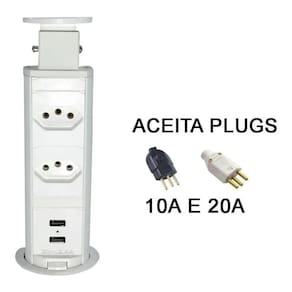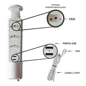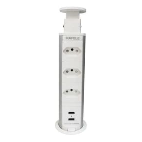 Totem retratil hafele plug-up 3t/2-usb 110-250v brancaA hfele conta com soluções para organizar e recarregar seus aparelhos eletrônicos em móveis e bancadas. Mantenha seus aparelhos sempre por perto e funcionando em qualquer ambiente.- versão com 3 tomadas saida de 16a cada- versão com 2 portas usb- estrutura em alumínio anodizado prata, peças em plástico- tensão 110-250v ac 50/60hz- cabo de energia com 1,75m- plugue de 20a- diâmetro de furo no tampo: 60 mm- espessura máxima do tampo 50 mmBenefícios:- designer moderno;- compacta;- fácil manuseio, após o uso basta empurrá-lo para baixo e seu corpo fica totalmente escondido dentro do armário ou bancada onde estiver inserido.