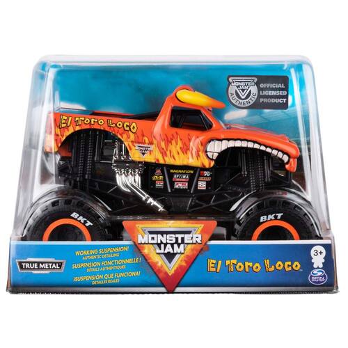 Veículo fundido sob pressão Monster Truck oficial El Toro Loco Monster Truck, escala 1:24 - MONSTER JAM OFICIAL: Melhore seu jogo com o novíssimo monster truck em escala 1:24! Com mais detalhes e gráficos do que nunca, esta réplica autêntica tem o estilo e a arrogância de uma coisa real! - CARACTERÍSTICAS REALISTAS: Um sistema de suspensão funcional absorve mais impacto para que os pneus de borracha BKT, que voam alto, batem carros e saltos nunca parem, e os pneus de borracha BKT proporcionam maior tração para levar seu caminhão a novos patamares! - COLECIONE TODOS ELES: Agora há mais monster trucks Monster Jam para colecionar do que nunca! Colecione todos eles e conquiste a vitória em seu próprio evento Monster Jam! Comece a colecionar hoje mesmo! - O melhor presente da lista de desejos: nossos brinquedos monster trucks são um presente perfeito de Natal ou aniversário para meninos e meninas a partir de 4 anos. As crianças vão adorar a diversão de alta octanagem de sua própria réplica realista de monster truck! - MONSTER JAM TRUCKS: fabricamos brinquedos autênticos licenciados com tema de monster truck, de veículos de controle remoto a caminhões fundidos sob pressão e playsets. Você nunca esteve tão perto da ação quanto com Monster Jam!