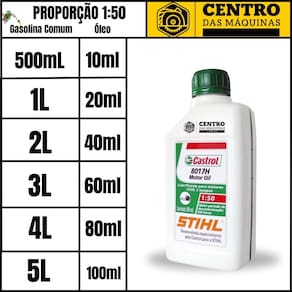 Operador, instrução de mistura recomendada para a utilização da máquina com o Óleo 2T CASTROL STIHL (1:50) 500ml : Observe sempre a proporção da mistura específica deste óleo, onde para cada 1 Litro de Gasolina utilizar 20ml do Óleo CASTROL STIHL, ou para cada 500ml de Gasolina utilizar 10ml do Óleo CASTROL STIHL. Além de manter o bom funcionamento, você pode prevenir futuras falhas e excesso de fumaça no cilindro de combustão.
