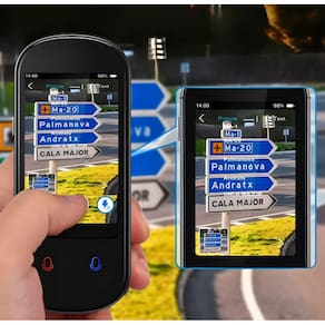 Tradução por Foto com Câmera de 8MP: Desvende o mundo ao seu redor! A câmera de 8 megapixels permite traduzir textos em imagens de menus, placas, documentos e muito mais, com suporte para 45 idiomas.