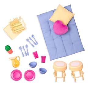 Inclui: trailer, colchão, duas almofadas, banquetas, facas e colheres, dois pratos, garfos, copos e potinhos, escorredor de louça com bandeja, jarra e um cacto. Boneca vendida separadamente.