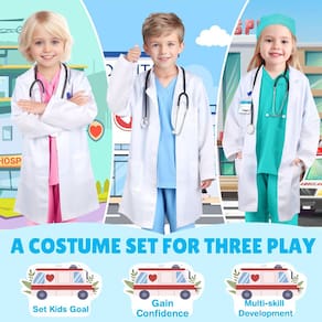 1 - 1 - Presente ideal para crianças de 3 a 12 anos - Esta fantasia médica pode atender às necessidades da maioria das crianças. Oferecemos 4 tamanhos deste jaleco e esfoliante infantil, incluindo pequeno para 3-4 anos, médio para 5-7 anos, grande para 8-9 anos e extra grande para 10-12 anos. E marcamos a faixa de altura e peso adequada para cada tamanho. Escolha o tamanho apropriado, consulte a imagem. Finja que jogar com este verdadeiro kit médico deixará as crianças mais engajadas e felizes o dia todo! - Traje médico para crianças com estetoscópio real - Vem com um estetoscópio real que pode ouvir sons reais de batimentos cardíacos. Ouvir os batimentos cardíacos ou a família não é apenas muito interessante para as crianças, mas também faz com que as crianças aliviem a ansiedade e o medo de ir ao médico. Crie horas de diversão com o kit de fantasias médicas para crianças. - Um kit didático e educacional para médicos infantis - Nossa fantasia de médico infantil certamente inspirará imaginação ao fingir que está brincando. Imagine-os como médicos, enfermeiros ou veterinários tratando outras pessoas ou animais de estimação. Melhora o pensamento criativo e ajuda seu filho a aprender mais sobre médicos, dramatizações e habilidades sociais para fingir ser médico. E as crianças podem se interessar em ser médicas. Talvez ela ou ele sonhassem em ser médicos no futuro. - Diversão infinita para dramatizar — Este jaleco e esfoliante infantis são ótimos para fantasias de Halloween para crianças, meninas e meninos, jogos de RPG, fantasias de dia de carreira para crianças, festas de aniversário ou festas temáticas em hospitais, etc. E o kit médico infantil é um excelente presente para uma criança pequena que gosta de fingir ser médica ou cientista. Ajuda seus filhos a desenvolver hábitos saudáveis. É uma fantasia de Halloween perfeita para meninas, meninos e todas as crianças.