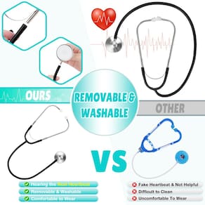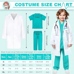 1 - 1 - Presente ideal para crianças de 3 a 12 anos - Esta fantasia médica pode atender às necessidades da maioria das crianças. Oferecemos 4 tamanhos deste jaleco e esfoliante infantil, incluindo pequeno para 3-4 anos, médio para 5-7 anos, grande para 8-9 anos e extra grande para 10-12 anos. E marcamos a faixa de altura e peso adequada para cada tamanho. Escolha o tamanho apropriado, consulte a imagem. Finja que jogar com este verdadeiro kit médico deixará as crianças mais engajadas e felizes o dia todo! - Traje médico para crianças com estetoscópio real - Vem com um estetoscópio real que pode ouvir sons reais de batimentos cardíacos. Ouvir os batimentos cardíacos ou a família não é apenas muito interessante para as crianças, mas também faz com que as crianças aliviem a ansiedade e o medo de ir ao médico. Crie horas de diversão com o kit de fantasias médicas para crianças. - Um kit didático e educacional para médicos infantis - Nossa fantasia de médico infantil certamente inspirará imaginação ao fingir que está brincando. Imagine-os como médicos, enfermeiros ou veterinários tratando outras pessoas ou animais de estimação. Melhora o pensamento criativo e ajuda seu filho a aprender mais sobre médicos, dramatizações e habilidades sociais para fingir ser médico. E as crianças podem se interessar em ser médicas. Talvez ela ou ele sonhassem em ser médicos no futuro. - Diversão infinita para dramatizar — Este jaleco e esfoliante infantis são ótimos para fantasias de Halloween para crianças, meninas e meninos, jogos de RPG, fantasias de dia de carreira para crianças, festas de aniversário ou festas temáticas em hospitais, etc. E o kit médico infantil é um excelente presente para uma criança pequena que gosta de fingir ser médica ou cientista. Ajuda seus filhos a desenvolver hábitos saudáveis. É uma fantasia de Halloween perfeita para meninas, meninos e todas as crianças.