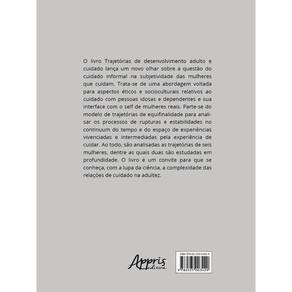 O livro Trajetórias de desenvolvimento adulto e cuidado lança um novo olhar sobre a questão do cuidado informal na subjetividade das mulheres que cuidam. Trata-se de uma abordagem voltada para aspectos éticos e socioculturais relativos ao cuidado com pessoas idosas e dependentes e sua interface com o self de mulheres reais. Parte-se do modelo de trajetórias de equifinalidade para analisar os processos de rupturas e estabilidades no continuum do tempo e do espaço de experiências vivenciadas e intermediadas pela experiência de cuidar. Ao todo, são analisadas as trajetórias de seis mulheres, dentre as quais duas são estudadas em profundidade. O livro é um convite para que se conheça, com a lupa da ciência, a complexidade das relações de cuidado na adultez.