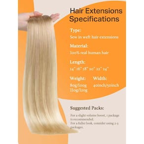 2. Especificações das extensões de cabelo: 14/40.6 cm: 80/100 g (pacote), 45.7-61.0 cm: 100 g/pacote.
