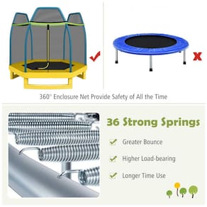 Descrição Este trampolim redondo de segurança ajudará os seus filhos a melhorar as suas capacidades de salto, ao mesmo tempo que promove o seu metabolismo corporal e melhora a sua imunidade. É caracterizado por uma forte estrutura de aço galvanizado e base triangular para aumentar a estabilidade, e a cerca de segurança está firmemente conectada à plataforma de salto para eliminar lacunas perigosas e proteger os pés do bebê contra lesões. A capa protetora de espuma EPE evita que seu filho colida acidentalmente ao pular livremente. Nosso trampolim é o presente perfeito para as crianças. Características Há uma rede protetora externa para proteger seu filho ao pular Rede protetora externa com zíper em forma de L, centro de atividades em grande escala Força de mola forte, grande força de tração, sem deformação A rede de segurança fortalece o amortecedor e tem forte resistência ao impacto Almofada de plataforma PP, desgaste capa protetora de espuma EPE resistente e de boa resiliência para evitar choques acidentais Pano Oxford acolchoado não belisca os pés do bebê Promove aumento de altura, melhora o efeito físico Especificações Material Aço galvanizado, PP, EPE Dimensão total 7,3 pés x 7,3 pés x 6,1 pés C x L x A Peso líquido 55 libras Capacidade de peso 220 libras O pacote inclui 1 x trampolim 1 x manual do usuário Rede de gabinete respirável Zíper em forma de L O trampolim infantil está equipado com uma rede de gabinete respirável. Ele não apenas mantém seu filho , mas também ajuda você a ficar de olho nos movimentos do seu filho. O zíper em forma de L tem um fecho aderente que é mais do que o zíper comum e pode garantir um melhor fechamento quando eles brincam. Trampolim de segurança para crianças O design perfeito entre a cerca e a almofada, para que seu filho não fique preso no vão. O protetor de espuma EPE evita que seu filho bata acidentalmente ao pular livremente. E o grande tapete de plataforma circular de 83 polegadas de diâmetro oferece espaço suficiente para as crianças. Estrutura galvanizada resistente Este trampolim infantil de 7 pés é composto por uma estrutura de aço galvanizado e uma base triangular reforçada. Ele pode suportar um peso de 220 libras e evitar efetivamente que escorregue ao pular da plataforma. Longa vida útil Anexado com mola espessa anti ferrugem, alta elasticidade, sem deformação, para garantir o uso a longo prazo. A almofada da plataforma de salto é confeccionada em material PP, com elasticidade de alta qualidade, permitindo que as crianças pulem mais alto e mais felizes. Presente perfeito para crianças. Dimensão geral 7,3 pés x 7,3 pés x 6,1 pés C x L x A. Este trampolim recreativo será um destaque atraente para o seu quintal e servirá como um centro de atividades ao ar livre para o seu tempo semanal de diversão em família, garantindo que seus filhos e amigos caiam na gargalhada todos os dias. O presente perfeito para crianças
