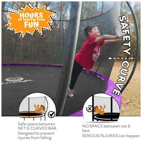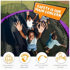 A diversão e segurança do seu filho são nossa responsabilidade! Para proteger sua família, inovamos nossos trampolins para crianças e adultos com postes curvos de última geração, projetados para evitar acidentes. Os trampolins Jumpzylla atendem à norma de segurança ASTM F381-16. Nunca comprometemos segurança ou qualidade. Nossa missão é oferecer um trampolim robusto para horas de diversão sem preocupações.