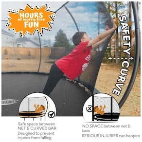 A diversão e segurança do seu filho - Nossa responsabilidade! Para a segurança de sua família, inovamos nossos trampolins para crianças e adultos com postes curvos de próxima geração, projetados para proteger seus filhos contra acidentes ou lesões. Os trampolins Jumpzylla atendem à norma de segurança ASTM F381-16. Nunca comprometemos a segurança ou a qualidade, nossa missão é oferecer um trampolim resistente para horas de diversão sem preocupações.