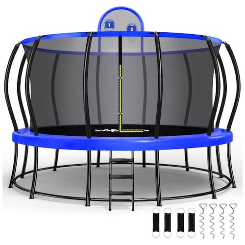 Fixação Poderosa: Estacas Espirais: Aprecie a diversão sem interrupções com nosso trampolim, projetado para resistir aos ventos mais fortes. Equipado com estacas espirais extra-longas de 34 cm, ao contrário das estacas tradicionais em formato de U, nosso trampolim permanece firmemente ancorado, garantindo que não caia e não sofra danos, mesmo em condições climáticas desafiadoras. Ideal para espaços externos compactos.