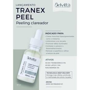 Tranex Peel Peeling Clareador 30ml - Belvittà - Descrição: O Tranex Peel Peeling é um peeling com eficácia prolongada no clareamento e prevenção de manchas de hiperpigmentação, especialmente o melasma. Sua associação exclusiva dos ácidos lático e tranexâmico com a niacinamida promove ação esfoliante, renovando rapidamente a epiderme, minimiza manchas causadas pelo sol, uniformiza o tom da pele, melhora a textura, aumenta o viço e a luminosidade da pele. Ativos: Ácido Tranexamico 5%: Previne a pigmentação da pele induzida pela radição UV do sol, reduz a ativação de mediadores inflamatórios que estimulam a produção de melanina, controlando a hiperpigmentação da pele, clareia, evita a formaçao de novas manchas e uniformiza a tonalidade da pele. Ácido Lático 10%: Considerado um dos ácidos mais seguros e eficazes, promove esfoliação e renovação da pele, suprime a atividade da enzima tirosinase, prevenindo a formação e atenuando manchas de hiperpigmentação, como o melasma, além de melhorar a textura e uniformizar a cor da pele. Niacinamida 5%: Inibe a transferência de melanina para as camadas mais externas, reduzindo a hiperpigmentação da pele, previne e clareia manchas, reduz diferenças de tonalidade e uniformiza a coloração da pele. Modo de Uso: Aplicar uniformemente sobre a pele limpa e seca. Enxaguar até a remoção total. Características Gerais do Produto: Acompanha o produto: 1 Tranex Peel Peeling Clareador 30ml - Belvittà : Contra Defeito de Fabricação Marca: Não Informado Ean: 7898943160393