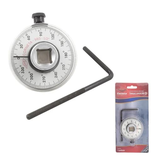 O medidor de ângulo é uma ferramenta que possibilita o aperto em parafusos com grande precisão e força, tendo a sua principal utilização por meio do torquímetro.Marca: cornetaCaracteristicas:-peso: 154g-encaixe quadrado de -medidor de 0 a 360º graus-possibilita aplicar os torques críticos aos parafusos com toda segurança e precisão-composição: aço cromo vanádio, aço carbono e pp-corpo em aço carbono-soquete forjado em aço cromo vanádio-resolução de 2Conteúdo: -01 transferidor de grau para torque angularAplicação: Indicado para aperto de cabeçotes e motores de veiculo que adotam o procedimento de torque mais giro, também pode ser utilizado na fixação de rolamentos críticos e de porcas de hélices de aeronaves.Cuidados:-nunca ultrapasse os limites de escala, evitando danos ao equipamento-não use tubos ou extensões para obter mais torques, isso pode danificar a ferramenta-retorne para o valor mínimo de torque da escala quando o torquimetro não estiver sendo utilizado, evitando assim danificar seu mecanismo interno (mola) por meio de esforços desnecessáriosCódigo: 9998000Perguntas frequentesEnviamos para todo brasil em até 24h úteis: simCom nota fiscal: simFotos reais: simTroca ou devolução até 30 dias: simEmitimos nota para pj: sim