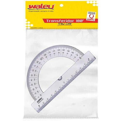 O Transferidor 180º New Line Waleu, é resistente, feito em poliestireno e perfeito para medições e realização de trabalhos escolares. Vendido unitário. Medidas aproximadas do produto - Comprimento: 16 cm - Altura: 3 cm - Largura: 14 cm - Peso: 190 g Marca: Não Informado Ean: 7897294403166