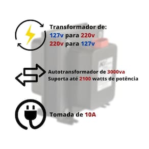 Conteúdo da embalagem: - 1 autotransformador 3000va - 1 cabo de 90cm - espessura 0,2mm - conector h/h com parafuso elimina o risco de choque elétrico