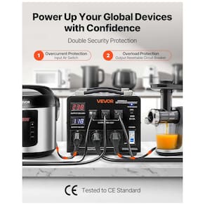 Possui 3 tomadas US padrão, 3 tomadas EU, 1 porta USB e 1 Type-C. Proteção dupla com interruptor aéreo contra sobrecorrente e disjuntor resettável contra sobrecarga assegura segurança durante uso contínuo. Dois displays LCD iluminados monitoram independentemente as voltagens de saída dos circuitos 110V e 220V.