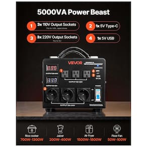 O transformador VEVOR HYMG-5000VA detecta automaticamente voltagem de entrada (110V ou 220V) através de sensores inteligentes, fornecendo saída correspondente sem necessidade de seletor manual. Inclui cabo US padrão; em redes 220-240V requer adaptador de plugue ou cabo local compatível. Capacidade máxima 4000VA com carga 80%, suportando operação simultânea de múltiplos aparelhos.