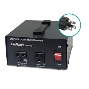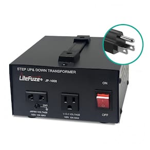 O transformador LiteFuze JP-1000 de 1000W converte voltagem entre padrões japonês 100V e americano 120V, operando como step-up (100V para 120V) para aparelhos japoneses em redes de 120V ou step-down (120V para 100V) para equipamentos de 120V em redes de 100V. Tecnologia ConvertingBox otimiza eficiência da conversão, reduzindo peso e ruído operacional em comparação a transformadores convencionais.