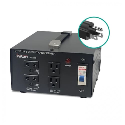 O transformador LiteFuze JP-3000 de 3000W converte eficientemente entre 100V e 120V, funcionando como step-up (100V para 120V) para aparelhos japoneses em redes de 120V ou step-down (120V para 100V) para equipamentos de 120V em redes japonesas de 100V. Equipado com fusível interno que interrompe a corrente em sobrecargas, protege o transformador e os dispositivos conectados contra picos elétricos.