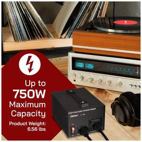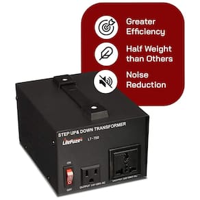 O transformador LiteFuze LT-750 de 750W executa conversão step-up (110/117/120V para 220/230/240V) ou step-down (220/230/240V para 110/117/120V), com seletor de entrada no painel traseiro conforme voltagem local. Tomada de saída universal aceita plugs globais com aterramento completo de entrada a saída, garantindo operação segura.