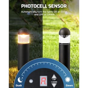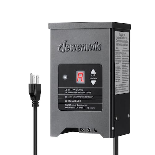 DEWENWILS Transformador de iluminação paisagística de baixa tensão para ambientes externos ilumine seus espaços ao ar livre com o transformador de iluminação paisagística DEWENWILS de baixa tensão, projetado para converter energia CA padrão de 120 V em uma baixa tensão segura de 12/15 V para todas as suas necessidades de iluminação paisagística. Este transformador robusto é projetado para oferecer desempenho confiável e inclui uma variedade de recursos para melhorar sua experiência de iluminação externa. Melhore o ambiente e a segurança do seu ambiente externo com o transformador de iluminação paisagística DEWENWILS Outdoor de baixa tensão. Ideal para caminhos de jardim, calçadas e outros espaços ao ar livre, este transformador oferece funcionalidade e durabilidade, tornando-o a escolha perfeita para suas necessidades de iluminação paisagística. Especificações: Tensão de entrada: 120 VCA, 60 Hz - Saída: 12/15 VCA - Classificação máxima de energia: 150 VA - [Saída e aplicação seguras de 12/15 V] Este transformador de iluminação de baixa tensão pode produzir uma tensão segura de 12/15 V CA, é uma escolha ideal para iluminação paisagística, oferecendo energia confiável para luzes de jardim, luzes de caminho e outras luminárias decorativas externas - [Fácil de operar e instalar] Use os botões "??" para definir o dispositivo para o modo "Always On", "Auto" ou "Countdown/Off", tornando-o conveniente para uso diário e economia de energia; com furos embutidos, nosso transformador de luz de piscina é fácil de montar diretamente na parede - [Sensor de fotocélula e temporizador] Com sensor do crepúsculo ao amanhecer, nosso transformador de baixa tensão multitoque liga automaticamente as luzes ao anoitecer e desliga ao amanhecer; o temporizador permite uma configuração de contagem regressiva que varia de 1 a 9 horas, liga automaticamente ao anoitecer e desligar após 1, 2, 3, 4, 5, 6, 7, 8, 10 horas - [Função de memória e proteção contra curto-circuito] Função de memória, o transformador de paisagem de 4 canais permanece o modo de temporizador que você selecionou antes, mesmo após falta de energia; proteção conveniente e segura contra curto-circuito oferece reinicialização automática após ocorrer uma falha - [Caixa revestida de metal e à prova d'água] O transformador de baixa tensão DEWENWILS para luzes de paisagem é projetado com revestimento de metal resistente, oferece proteção contra os elementos e permanece à prova d'água e resiste efetivamente à corrosão ao longo do tempo