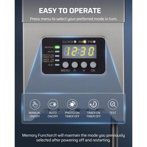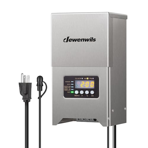 Transformador de iluminação paisagística DEWENWILS 300W Ilumine seus espaços ao ar livre com facilidade usando nosso transformador eficiente de baixa tensão de 300 W! Converta a tensão doméstica padrão em uma saída segura e estável de 12 V/15 V para iluminação segura. Perfeito para luzes de paisagem, iluminação externa, pátio ou jardim. 5 modos selecionáveis: ? Liga/desliga manual: pressione ?? para ligar/desligar ? Liga/desliga automaticamente: sensor de fotocélula embutido, liga automaticamente ao anoitecer e desligar ao amanhecer ? FOTO ON TIMER OFF: Ligue automaticamente ao anoitecer e desligar na hora que você definir ? TIMER ON/OFF: liga/desliga automaticamente com base no temporizador ? TESTE: Teste se o sensor fotoelétrico está funcionando corretamente Especificações: - Modelo: MTM0300-15-DIGI-SS - Tensão de entrada: 120VAC, 60Hz - Saída: 12/15VAC - Classificação de potência máxima: 300W - [Sensor e temporizador do crepúsculo ao amanhecer] Sensor de fotocélula embutido, este transformador de paisagem de baixa tensão liga automaticamente ao anoitecer e desligar ao amanhecer; com a função TIMER, você pode ligar e desligar o temporizador das luzes de paisagismo ou ligar automaticamente ao anoitecer e desligar no horário definido - [5 modos de configuração] Pressione "MENU" para percorrer 5 modos: liga/desliga manual, liga/desliga automática, temporizador desligado, temporizador liga/desliga, teste, atendendo aos seus requisitos de configuração e melhorando a eficiência energética; o modo de teste permite que você verifique a funcionalidade do sensor de luz - Amplamente compatível e seguro: 300 W, este transformador de baixa tensão converte tensão doméstica de 120 V CA em tensão de segurança de 12 V/15 V CA, fornecendo uma fonte de iluminação estável e segura; amplamente utilizado em luzes de paisagem, holofotes, luzes de degrau, luzes externas, luzes de pátio ou luzes de jardim e todos os tipos de luzes de baixa tensão - [Proteção contra sobrecarga e função de memória] Proteção de circuito embutida, falha ou sobrecarga será cortada automaticamente para proteger as luzes da paisagem de danos, mais confiável e segura; sem reinicialização manual após falta de energia, nosso transformador de paisagem manterá o modo que você selecionou antes - [Estrutura antiferrugem] Feito de aço inoxidável durável, este transformador DEWENWILS 300W é à prova d'água e resistente à corrosão para proteger a fonte de alimentação em climas adversos, garantindo uso duradouro