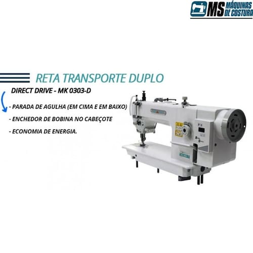 Máquina de Costura Transporte Duplo Direct Drive Atributos: Máquina reta industrial direct drive com transporte duplo, motor direct drive, uma agulha e ponto fixo. Possui um sistema de barra de agulha fixa, sistema duplo por dente e calcadores. Fácil ajuste para sincronizar à altura dos calcadores que auxiliam no transporte de materiais pesados como couro, lona e sintéticos. Motor direct drive capaz de economizar até 60% de energia comparado com motores convencionais, além de garantir maior agilidade na produção, com parada superior e inferior.