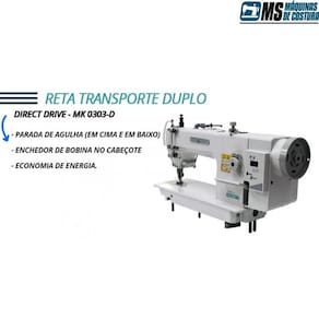 Máquina de Costura Transporte Duplo Direct Drive Atributos: Máquina reta industrial direct drive com transporte duplo, motor direct drive, uma agulha e ponto fixo. Possui um sistema de barra de agulha fixa, sistema duplo por dente e calcadores. Fácil ajuste para sincronizar à altura dos calcadores que auxiliam no transporte de materiais pesados como couro, lona e sintéticos. Motor direct drive capaz de economizar até 60% de energia comparado com motores convencionais, além de garantir maior agilidade na produção, com parada superior e inferior.