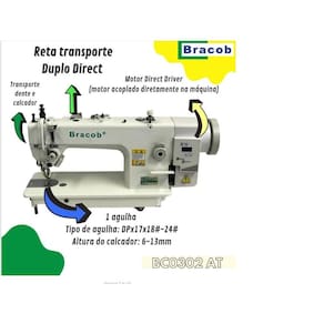 Altura do Calcador: 8/10mm Altura do Dente: 0.5 a 2mm Tamanho do Ponto: 0.5 a 8mm velocidade: 2.000 ppm Lubrificação: Automática Motor: Direct Drive Voltagem: 220 vts