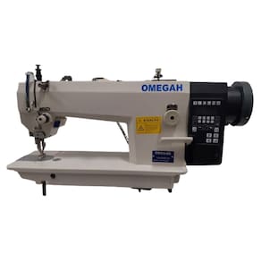 OM0303-D4 Máquina de costura industrial reta com transporte duplo (dente e calcador) eletrônica direct drive com posicionamento de agulha (parada de agulha), corte de fio automático e levantamento elétrico (solenóide) do calcador. Aplicação para tecidos médios a pesados (estofaria, jeans, napa, couro etc).