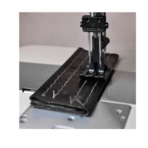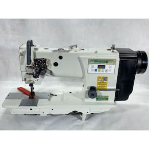 Máquina Reta 2 Agulhas com ponto fixo, lubrificação automática e transporte triplo por Dente calcador e agulha (evita o franzimento do tecido), indicada para materiais pesados como estofados, couros, lonas, sintéticos entre outros.
