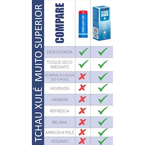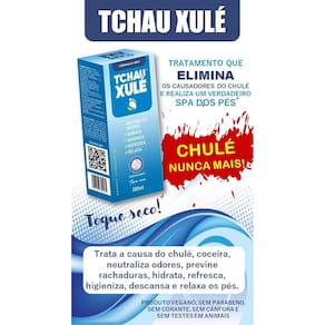 Tchau xulé trata a causa do mau odor nos pés, protege contra rachaduras, possui toque seco, seca instantaneamente e protege contra fungos e bactérias deixando os pés livres de agentes que geram cheiro ruim.