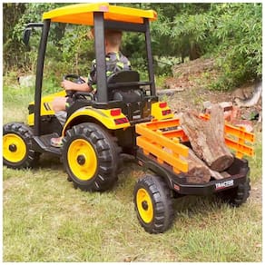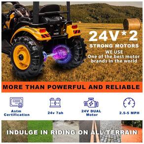 Trator para crianças 24V com reboque destacável As crianças andam em um trator equipado com um reboque destacável. As crianças vão adorar carregá lo, dirigir até o destino e descarregá lo. O trailer não só pode zenar alguns pequenos brinquedos e lanches, mas também permitir que as crianças dirijam no quintal ou no jardim e carreguem ferramentas de jardinagem para mais diversão. Anexa e desconecta facilmente, até mesmo seus filhos pequenos podem colocá lo e retirá lo.