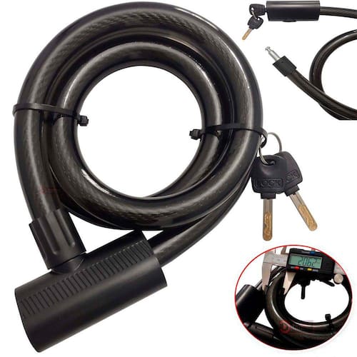 Esta trava é ultra resistente com cabo de aço endurecido de 20mm, revestido em material plástico com 1,20m de comprimento.