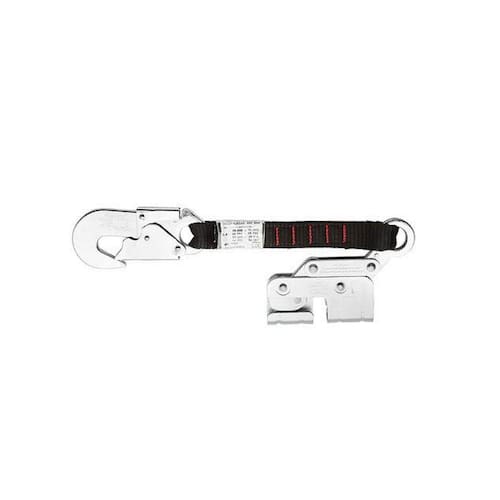 Características: . Ca36.899 . Trava quedas Mosquetão conector 17 Fita tubular 25 mm Termo retrátil 100mmx35mm . Descrição . Dispositivo confeccionado em chapa de aço anti-oxidante, para corda em poliamida de 12mm, possui 1 conector em aço, dupla trava com abertura de 17mm, extensor em fita de poliéster de 25 mm de largura. Obs: com trava de segurança