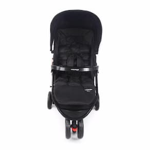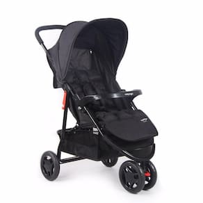 Para os pais, tem manopla com revestimento macio, capota retrátil com visor, amplo cesto porta-objetos com capacidade para 5 kg e bolso na capota. Trava de giro na roda dianteira e freio interligado, de fácil acionamento, nas traseiras.