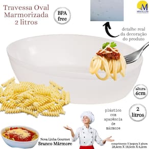 Travessa funda oval de plástico 2 litros para cozinhar e servir refeições, com decoração predominantemente branca com leves traços/ranhuras pretas por toda a peça, que traz uma aparência marmorizada super requintada à travessa.