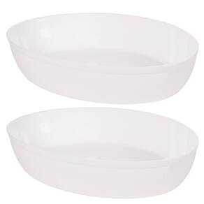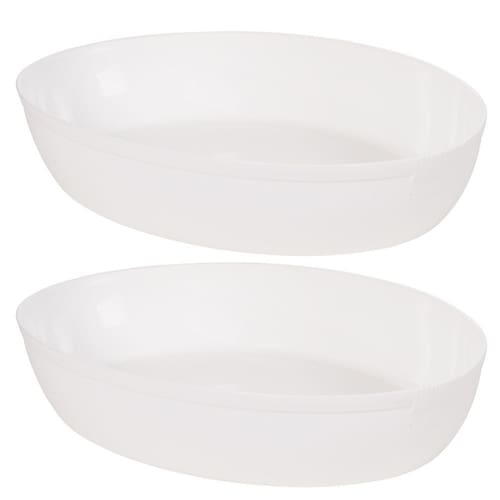 Travessa funda oval de plástico 3 litros para cozinhar e servir refeições, com decoração predominantemente branca com leves traços/ranhuras pretas por toda a peça, que traz uma aparência marmorizada super requintada à travessa.