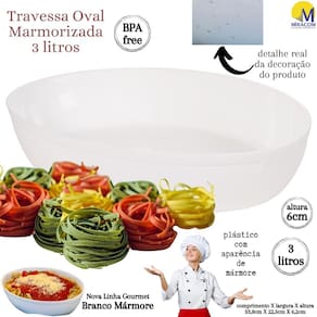 Travessa funda oval de plástico 3 litros para cozinhar e servir refeições, com decoração predominantemente branca com leves traços/ranhuras pretas por toda a peça, que traz uma aparência marmorizada super requintada à travessa.