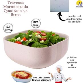 Este produto da nova linha marmorizada traz um toque peculiar, estiloso e moderno aos seus utensílios de servir. A travessa conta com um espaço generoso para servir saladas, churrasco, massas, enfim, refeições volumosas. O produto é fabricado em polipropileno atóxico de alta densidade, totalmente seguro para a alimentação e livre de BPA em sua composição. A decoração no fundo do produto é permanente devido à tecnologia intraimagem aplicada em sua fabricação, que não permite desbotamento e mantém os detalhes marmorizados vivos por mais tempo. A travessa, inclusive, pode ser levada com segurança tanto ao freezer como microondas, sem comprometimento da integridade do material e tampouco da saúde de quem nele se serve. O produto suporta temperaturas extremas variantes entre -10º e 120º, embora não possa ser levado ao forno convencional.
