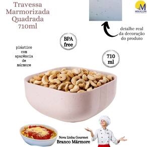 Travessa funda quadrada de plástico 710 ml para cozinhar e servir refeições, com decoração predominantemente branca com leves traços/ranhuras pretas por toda a peça, que traz uma aparência marmorizada super requintada à travessa.