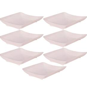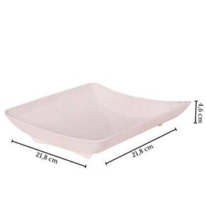 Travessa rasa quadrada de plástico com pés para servir porções, petiscos e antepastos, com decoração predominantemente branca com leves traços/ranhuras pretas por toda a peça, que traz uma aparência marmorizada super requintada à travessa.