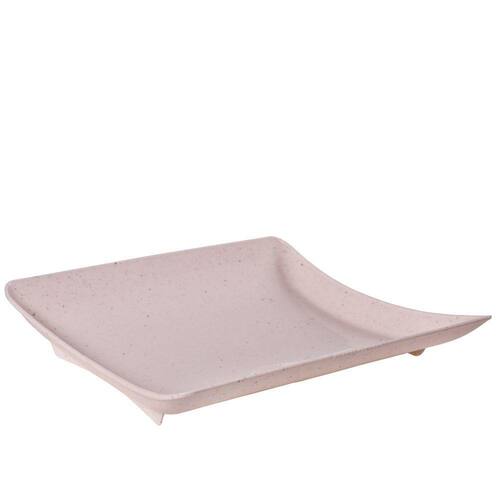 Travessa rasa quadrada de plástico com pés para servir porções, petiscos e antepastos, com decoração predominantemente branca com leves traços/ranhuras pretas por toda a peça, que traz uma aparência marmorizada super requintada à travessa.