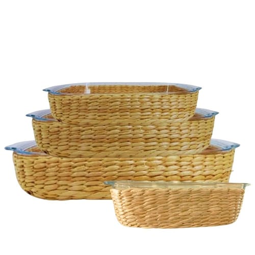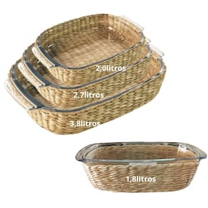 Travessa e Assadeira Refratárias 4un Vidro com Suporte de Rattan