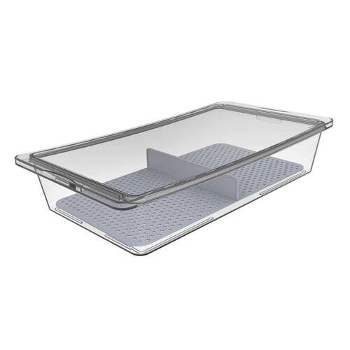 Garantia: 90 dias / Peso: 870g / Cor predominante: transparente / Referência: 403150002; Dimensões: 42cm (C) x 22,8cm (L) x 8,2cm (A); Capacidade: 4,8L; Conteúdo: 1 travessa hermética com divisória; Materiais: poliestireno, polipropileno e laprene.