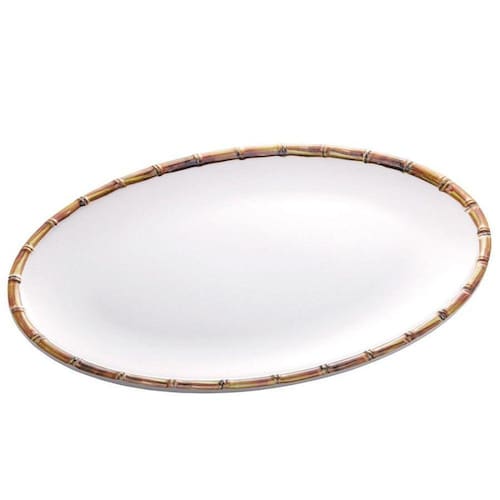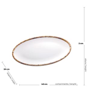 Travessa Oval Melamina Bambu Asper 40 cm - Mimo StyleTravessa Oval de Melamina Bambu Asper 40 cm, é o utensílio perfeito para o serviço de mesa posta. feito em melamina com detalhes tipo bambu, material resistente e leve. Seu design é elegante, trazendo modernidade à mesa e sua estampa acrescenta na decoração da casa. Complete o seu conjunto com os outros itens da linha Bambu Asper.Características:Material: MelaminaDimensões: altura: 2 cm x Comprimento 40 cm x largura 28 cmCor :Branca detalhes bambuCuidados com a peça: Lavar com detergente neutro e esponja macia, não utilizar abrasivos. Não utilizar em micro ondas e lava louças.Imagens meramente ilustrativas os objetos não acompanham o produto.